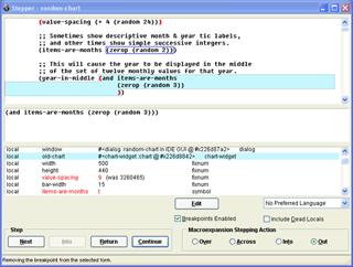 The source stepper displays source code while stepping through a form. When using it with the IDE, the source stepper is associated with the new Stepper Dialog. The Stepper Dialog allows carefully testing compiled code by interrupting execution at selected forms in the original source code and at macroexpansions of the code, allowing state to be examined at each stop point.