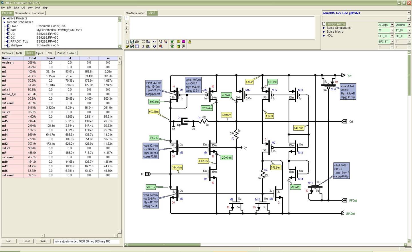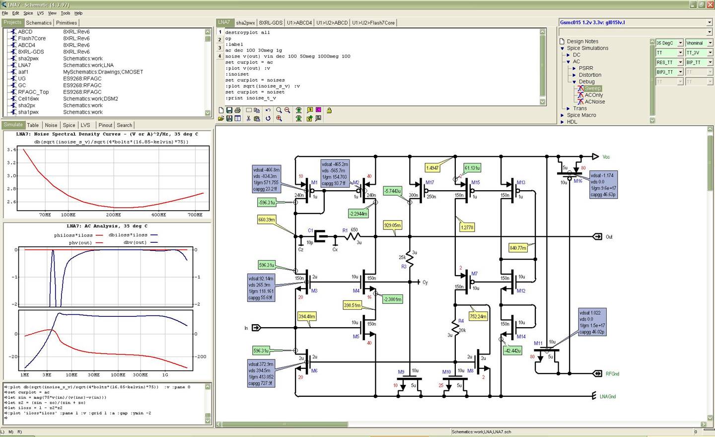 Schemata supports interfaces to LVS/DRC via LVS netlists, it reads StarRC layout files and provides post layout simulations and back annotations. It is however only an Analog Design tool – use it for complex analog cells. Schemata is not compatible with any other design tools. Schemata does however write all the standard netlist formats (.sp, .cdl . etc) including a very nice Verilog format so you can still use it. You can certainly use Schemata to learn about analog design – it is extremely effective at rapidly developing and testing analog cells. When you become familiar with Schemata you will find you can draw a new op-amp, plot response measure settling time and bandwidth in minutes if not in fact in seconds.