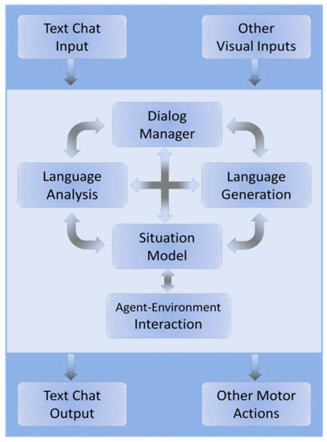 The other components of the Synthetic Teammate have been under research and development in-house for the past 3 to 5 years. To represent the synthetic teammate's situation and task awareness, we are developing a situation model (Rodgers et aI., 2012). The situation model interfaces with the language analysis and agent-environment interaction components (Myers, 2009). The agent-environment interaction component implements the task behavior of the synthetic teammate, interacting with CERTT to fly the simulated RPA. The language generation component generates messages, which are sent to human teammates. Basic dialog management capabilities have also been implemented. An overview of the synthetic teammate, highlighting the major components, is shown in Figure 1.