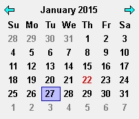 Some calendar cells are displayed in a special way. By default, the currently-selected date displays a light-blue background and a blue border. The date that's currently under the mouse has a similar style using fainter colors. Today's date is drawn with red text. And dates for the next and previous month (which share the first and last week of the displayed month) are drawn with gray text. Any of these styles may be modified by using the cell-style, cell-style-selected, cell-style-under-mouse, cell-style-current-date, and cell-style-other-month properties of the widget, respectively. And you can avoid drawing today's date in a different way by simply turning off the highlight-current-date property.