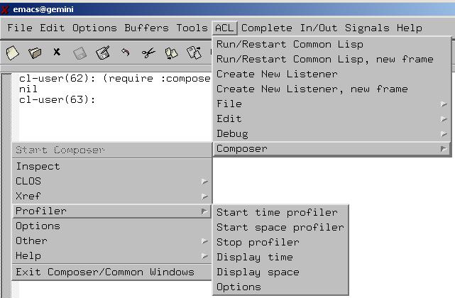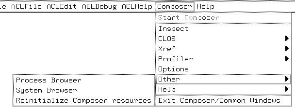 There are a number of Emacs menus associated with Allegro CL that are submenus of the ACL menu, including File, Edit, Debug, and Composer. When Allegro Composer is started, the ACL/Composer Menu items become available. (More precisely, before Allegro Composer is started, only the Start Composer item is available. After Allegro Composer is started, that item becomes unavailable, and the remaining items become available.