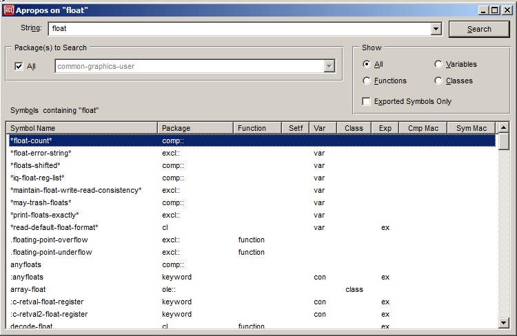 If All is selected, all symbols fitting other criteria (contain string, accessible in package) are displayed. If Functions is selected, just those symbols naming functions (or generic functions or macros) are displayed. If Variables is selected just those symbols that have a value are displayed. If Class, just those naming a class. Changing the Show field causes the display to be updated immediately. Note that a single symbol can name a function, a variable and a class.