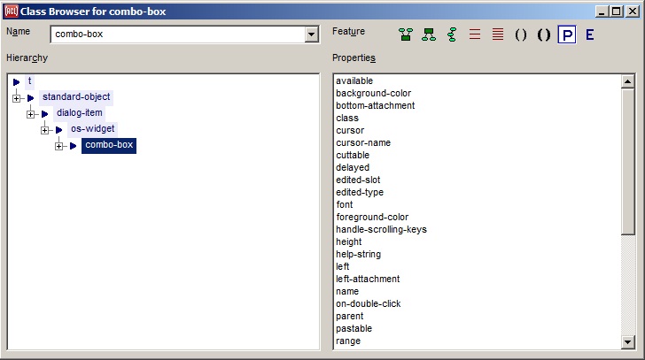 The information displayed in the pane on the right depends on which of the Feature toolbar icons is slected. Positioning the mouse over an icon will display a tooltip naming the icon (we use those names in the description below). The first seven refer to any class and the last two (P and E for Properties and Events) apply to Common Graphics-related classes.