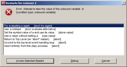 Clicking on Abort will cause the error to be unwound. Clicking on Debug changed the display of the Debug window to look like this, with the listener below and the debugging pane above: (click here to see the description of the listener in the Debug window):