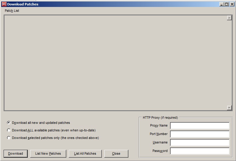 The display portion of the dialog displays (when commanded - it is blank when the dialog is first displayed) available patches, along with a checkbox to indicate whether or not the patch should be downloaded). The command buttons are (the radio buttons are described with the Download button):