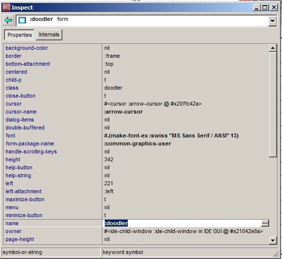 The buttons at the top (in the illustration, Properties and Internals, other objects may have more or different buttons), indicate what pane of the window is visible. In the illustration, the Properties pane is visible and the button looks pressed. Properties are usually changeable aspects of the object while Internals should not normally be modified. Controls have an Events button listing the event functions called when certain mouse events occur over the control.