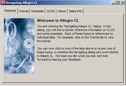 About: displays a short paragraph about Allegro CL.