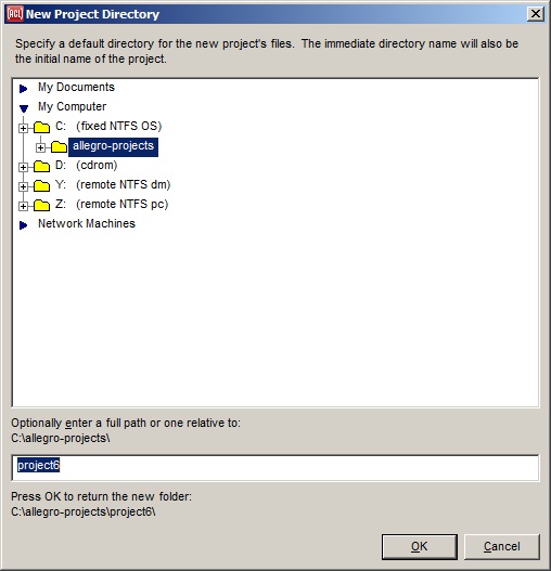 There is a default parent directory for Allegro projects, shown as the parent in the illustration (it is C:\allegro-projects). This directory is chosen by the Project Parent Directory dialog. That dialog appears the first time a new project is created.