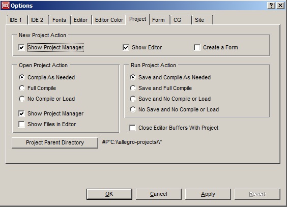 Project tab on Options dialog