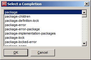 This dialog is displayed by the Search | Complete Symbol menu command when the list of possible completions is too long to fit on a simpler control. Here we have entered "p" and chosen Search | Complete Symbol. There are many symbols starting with p. Choosing Search | Complete Symbol when "page-" is entered displays this simpler dialog without a title.