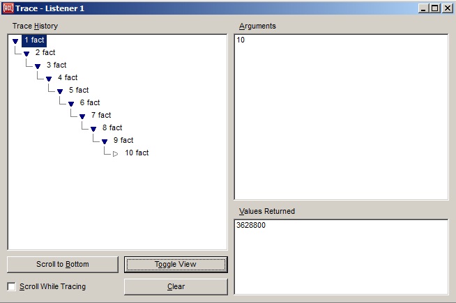 The Trace Dialog provides a graphical display of all calls to traced functions and methods that occur while the dialog is present. This includes functions that are traced by calling trace or using the :trace top-level command as well as functions that are traced by selecting the function name in any IDE dialog and invoking the Run | Trace command.