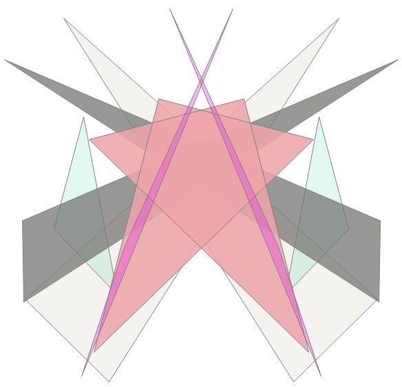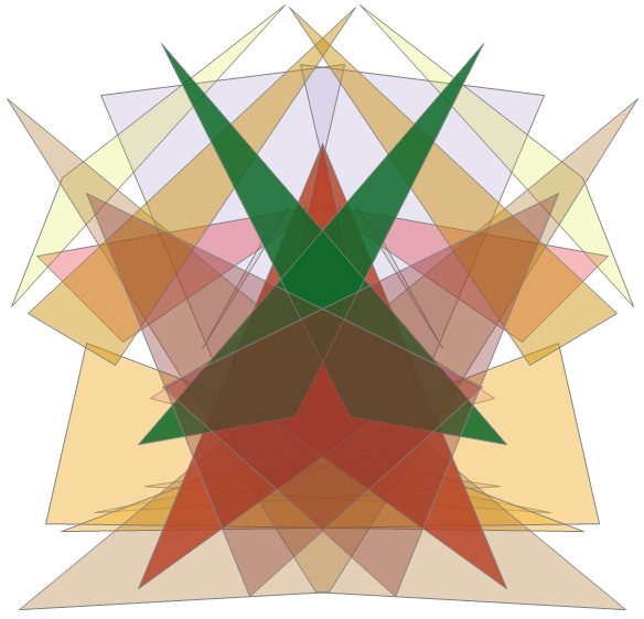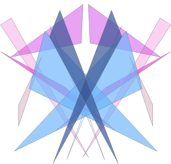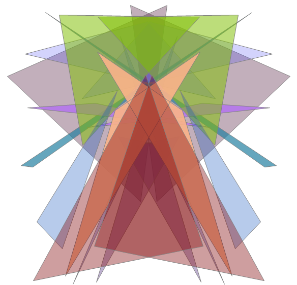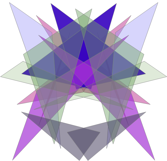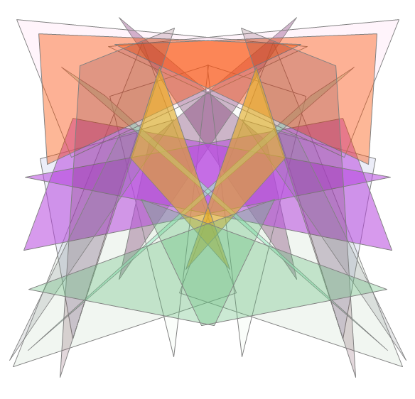 This example simply generates a set of random triangles and fills them with random colors that use random amounts of alpha blending, and adds bilateral symmetry. Clicking the window generates another image. The alpha blending works only on the Windows platform, but the code runs elsewhere.