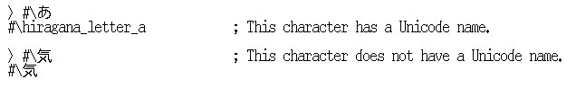 Lisp characters can be represented using the `#\[name]' syntax, where [name] is the character's Unicode name. Since the Unicode naming convention uses spaces in character names, and since the Lisp character reader treats space as a token delimiter, #\_ (underscore) characters are used to act as spaces in the Unicode name. For example, the following shows the unicode name for u+0141: