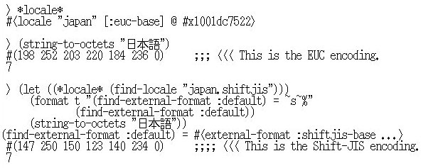 Note on examples with non-ASCII characters: This document contains some examples with non-ASCII characters to illustrate Allegro CL's ability to represent them. These examples are displayed using JPEG pictures, and therefore you cannot cut and paste them, as you can with examples containing only ASCII characters.