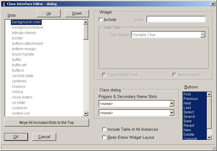 The Class Interface Editor will create widgets or grid columns in the order that they appear in the list of all slots (ignoring the slots that are not included). This will be widgets from top to bottom in an object-editor dialog, or grid columns from left to right in a class-grid. You can therefore change the order in the list of slots to control the widget order. The Move All Included Slots to the Top button may by handy to use first in order to group all of the currently-included slots together at the top of the list. You can then move individual slots using the Up and Down buttons, or more quickly by left-clicking and dragging slot names to new positions.