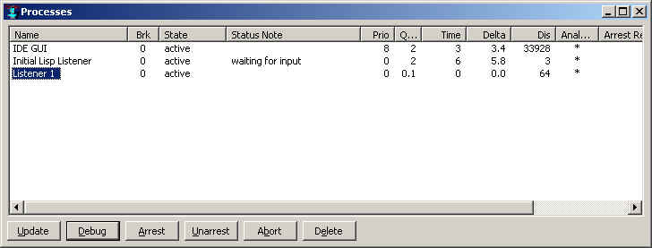 The process dialog displays information about the processes within Lisp. See multiprocessing.htm for information on processes. It is displayed with the View | Processes menu item.
