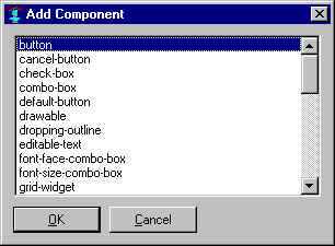 This dialog is displayed by the Form | Add Component menu command, when a form is selected. The dialog allows adding a component to the form. A component is a control or a non-visible object with programmatic effect. (Controls are always visible.) Only controls are supported at this time, so this dialog allows adding controls to a form.