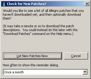 This dialog sometimes appears just after the IDE has started up to remind you that you may want to check for new Allegro patches that you have not yet downloaded.