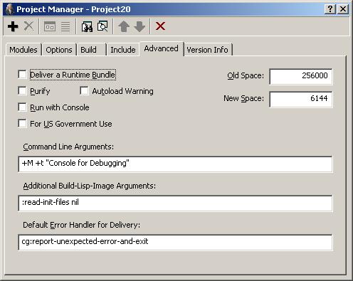 The Advanced Tab of the Project Manager Dialog displays certain advanced options for the application associated with the project. The options and controls are: