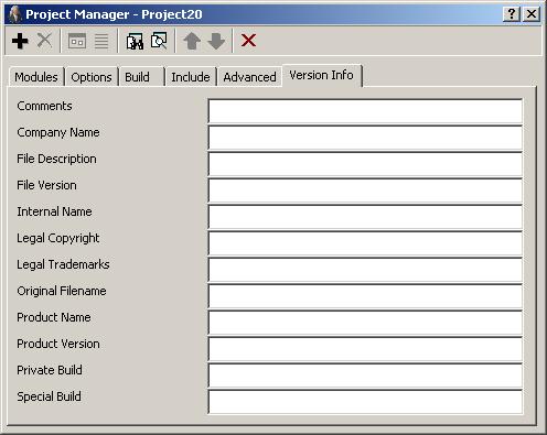 This tab on the Project Manager dialog allows entering version (and other) information about the standalone application for the project, which is used by the Windows operating system. The information is ignored on other platforms.