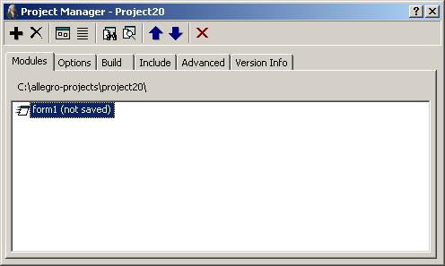 As shown in the illustration, the Project Manager has six tabs, Modules, Options, Build, Include, Advanced, and Version Info.