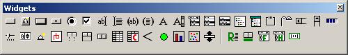 The Widget Palette has icons for the various components that can be displayed on forms. It is displayed with the Form | Show Widget Palette menu command. You can also display the palette by clicking in the background area of a form window, unless the show-widget-palette-when-click-form option has been turned off.