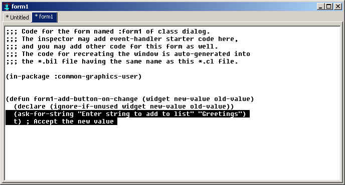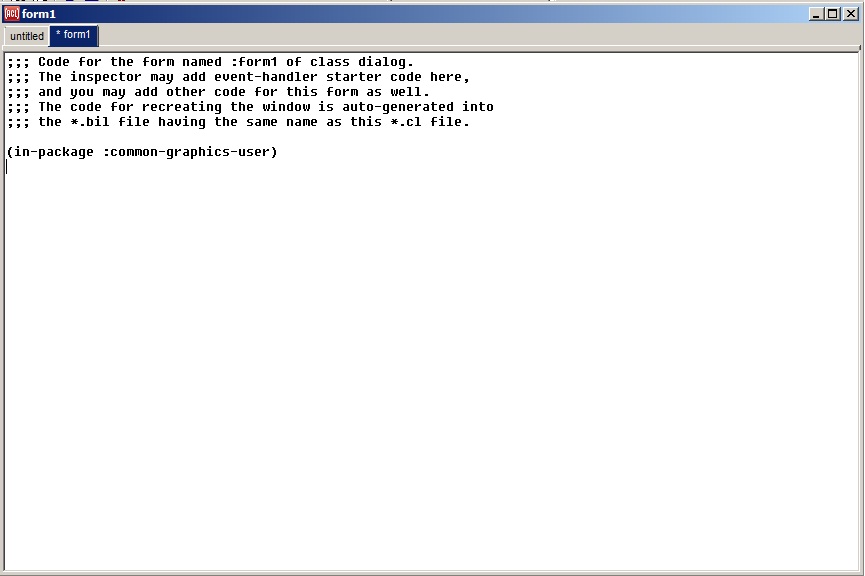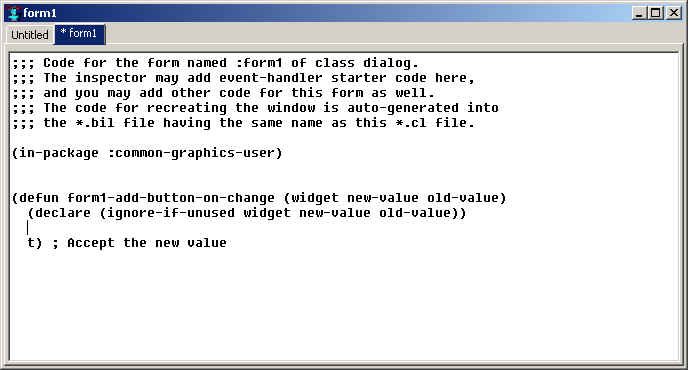 We will be adding code for event handlers for controls on the form in this buffer presently. (Note: if we do not display this buffer before we start editing event handling code, the initial event handling function code is stored in a hidden buffer. Then when this form1 buffer is used, redefinition warnings will be displayed when the code is compiled. Such warnings, if they appear, may be safely ignored.)