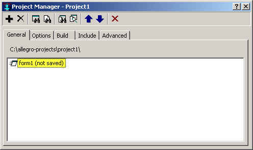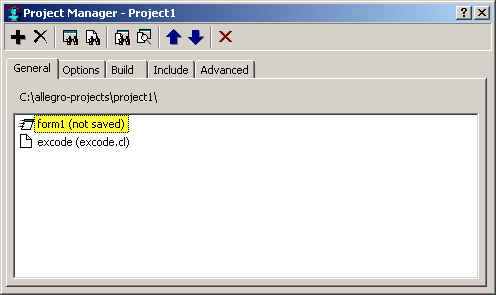We have to be sure that the project contains all the modules necessary, form1 and the untitled (or excode.cl if you saved it) files. Lots of files are included in an application so we strongly recommend that you start with an empty folder (like the C:\allegro-projects\project1 subfolder suggested by the system early in this discussion).