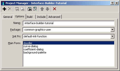 The tutorial application is called the doodler (the name of the project is the :interface-builder-tutorial project). It has four windows and dialogs: one for choosing a background color,