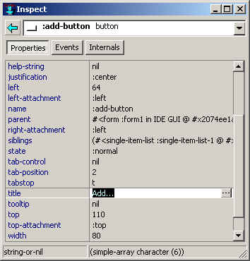 Now we want to change the name and the title of the button. Select the button, and go to the Inspector, change the name field to :add-button and the title field to Add . Here is the Inspector when those changes are made. Also notice the title of the button on the form is changed to Add .