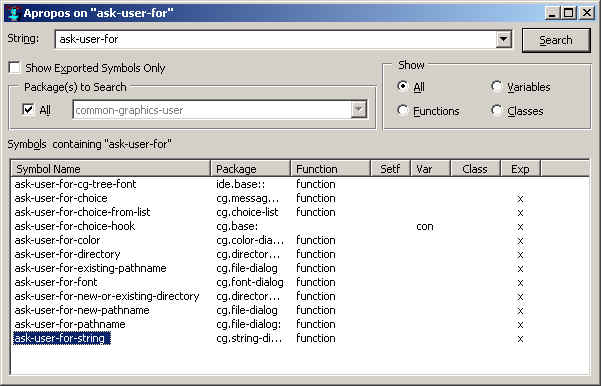 Bring up the Apropos dialog by clicking Search | Apropos. Enter ask-user-for in the String box and click Search. All symbols whose names start with ask-user-for are displayed; ask-user-for-string is at the bottom.