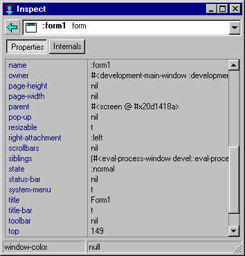 Now back to the inspection of Form1. (Double-click on the form if the inspector is hidden). The inspector looks like this: