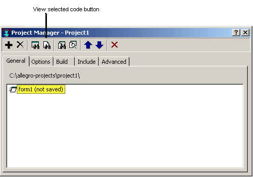 Also now display the code associated with form1 in an editor buffer. Do this by selecting form1 in the Project Manager dialog and clicking on the View Selected Code button.