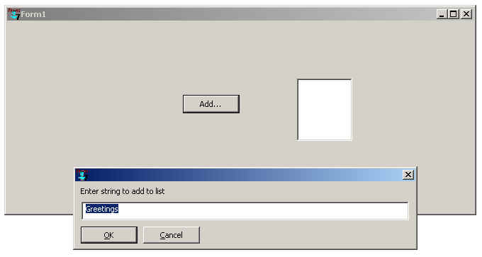 After you have saved the files or not, an active dialog appears. When you click on the Add button, a dialog asking for a string, with default Greetings, should appear. We show part of the form and the two dialogs.