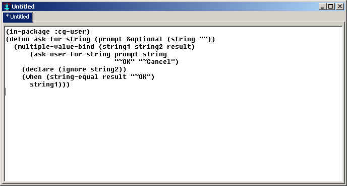 Second, we need to define a function that will be used in the application. This function will display the dialog asking for a string. Go to the editor workbook window (click View | Editor if the editor workbook is not visible -- that command brings it to the front). This window uses a tab control to display editor buffers, which may or may not be associated with files. It starts with a single unsaved buffer named Untitled (there may be a form1 buffer as well):