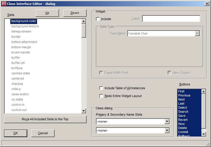 The Class Interface Editor will create widgets or grid columns in the order that they appear in the list of all slots (ignoring the slots that are not included). This will be widgets from top to bottom in an object-editor dialog, or grid columns from left to right in a class-grid. You can therefore change the order in the list of slots to control the widget order. The Move All Included Slots to the Top button may by handy to use first in order to group all of the currently-included slots together at the top of the list. You can then move individual slots using the Up and Down buttons, or more quickly by left-clicking and dragging slot names to new positions.