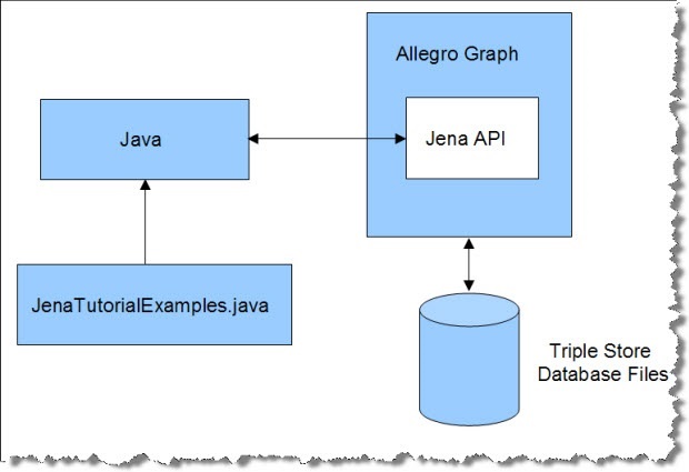 The Jena client tutorial rests on a simple architecture involving AllegroGraph, disk-based data files, Java, and a file of examples called JenaTutorialExamples.java.