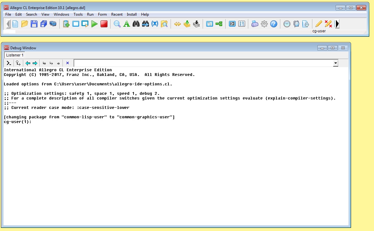 The IDE will look like this (after it is restarted -- that option cannot be changed in a running Lisp; the yellow is the Windows background color):