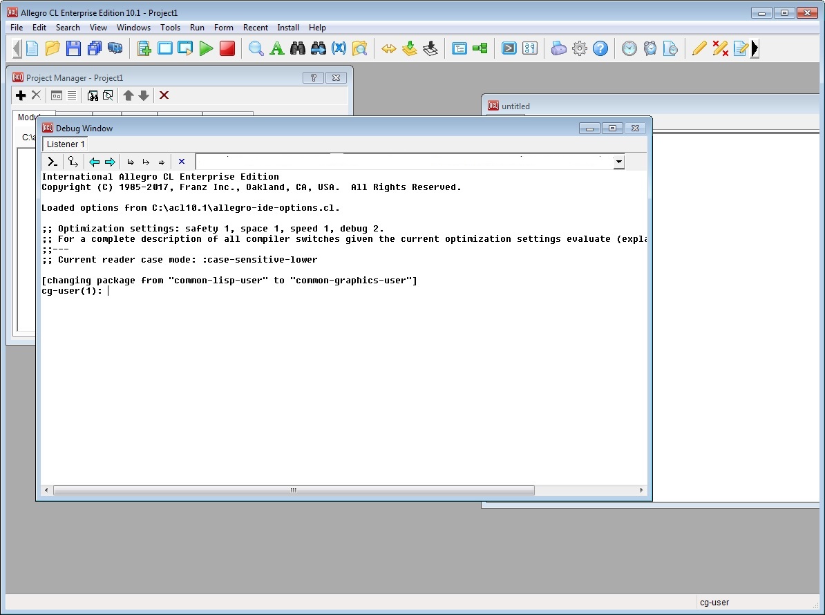 Now the status bar is on the bottom of the Project window. The current package (common-graphics-user, nickname cg-user) is displayed to the right of the status bar. See the note below if you want more items on the toolbar.